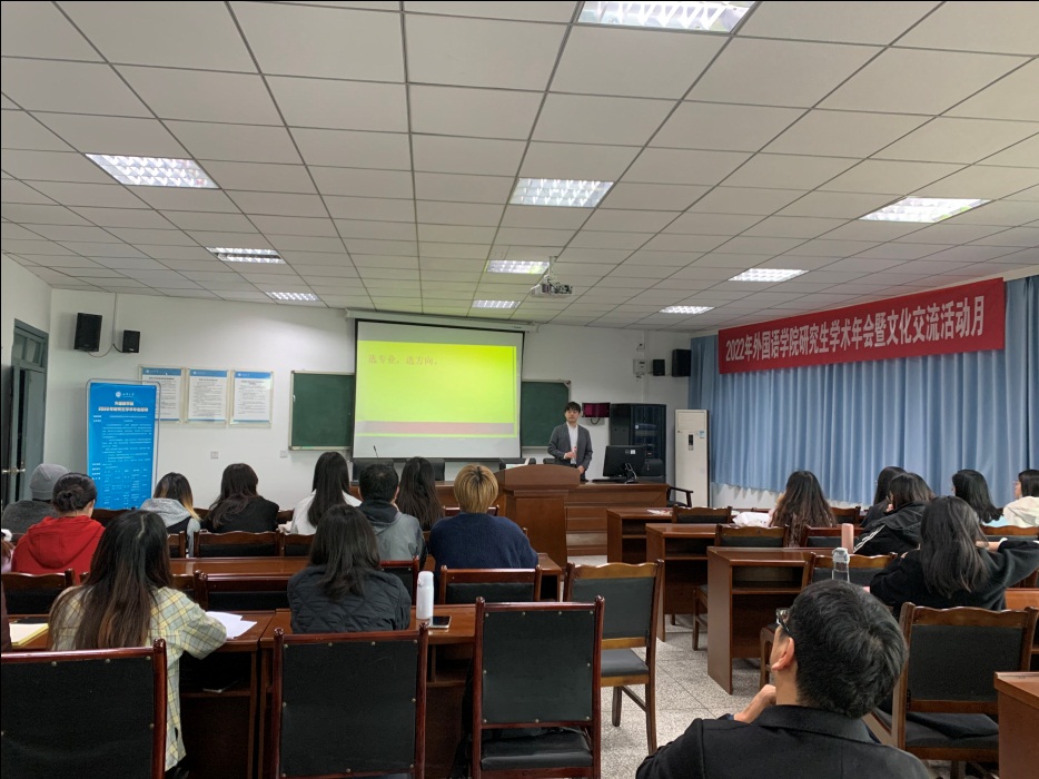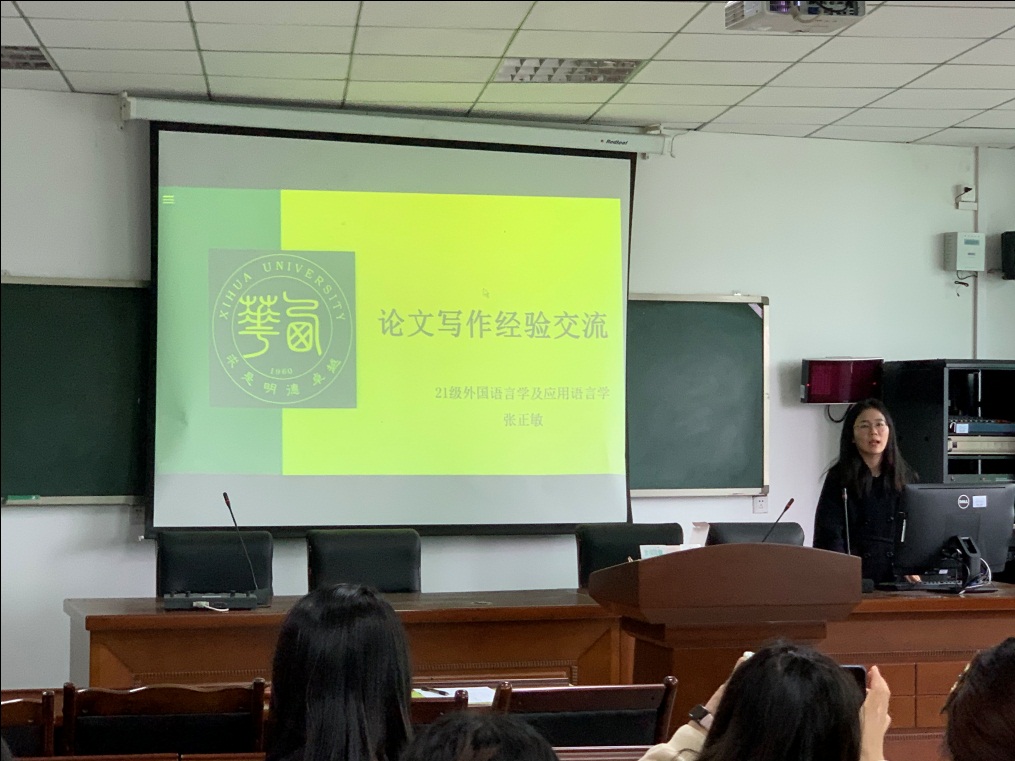 2021级外国语言学及应用语言学专业的张正敏同学,针对论文写作提出了自己的建议。她提出研究生应什么时候写、可以投到哪里等有用信息,为研究生同学们理清了时间线。她还强调需关注学界动向,在写论文时引用借鉴学界最新的论点,并进行理论方面日常积累。