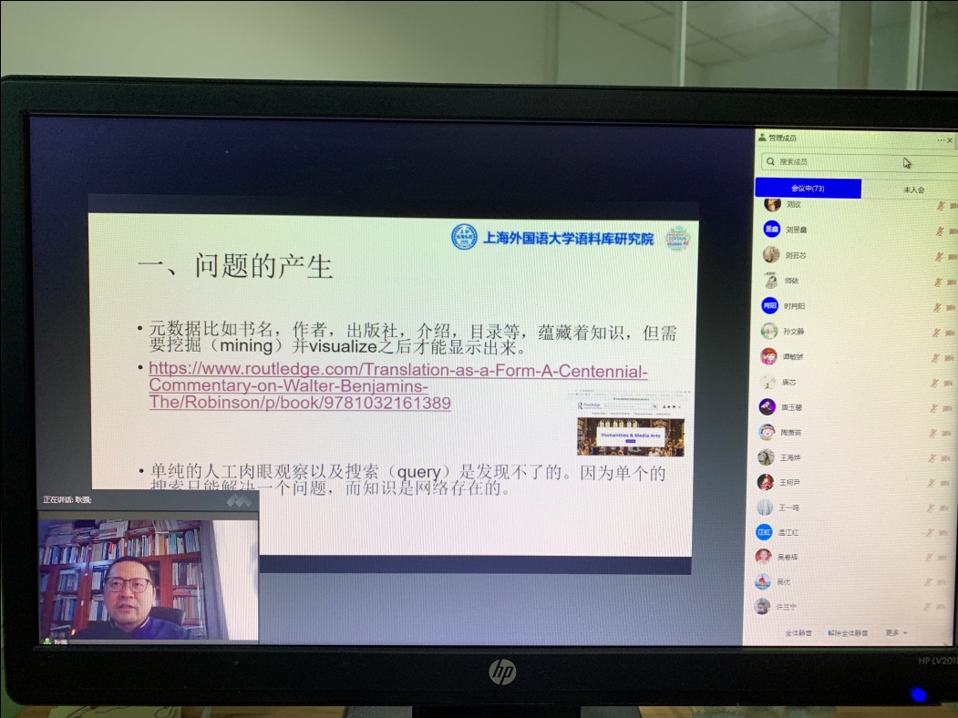 耿强教授讲道,大数据时代背景下我们的知识生产方式和传播方式已经发生了很大的改变。我们生活在一个印刷和数字混杂的时代。教授由此引出翻译研究的学科知识传播这一话题。元数据是大数据时代翻译知识生产的副文本,可以使用技术手段将其转化为信息和知识。耿教授指出在知识量快速增加的当下,传统的翻译书评这种优选个别文本进行细读的质性研究方法值得怀疑。但与此同时,翻译知识生产所产生的大量元数据无人问津。在大数据时代,元数据构成了翻译知识传播的重要渠道。我们必须转变思维,从信息搜索过渡到数据挖掘,利用各种数字工具对翻译知识本体和元数据进行知识管理、挖掘和生产,结合远读和细读,量性和质性方法,更好地推动翻译知识的跨文化传播。