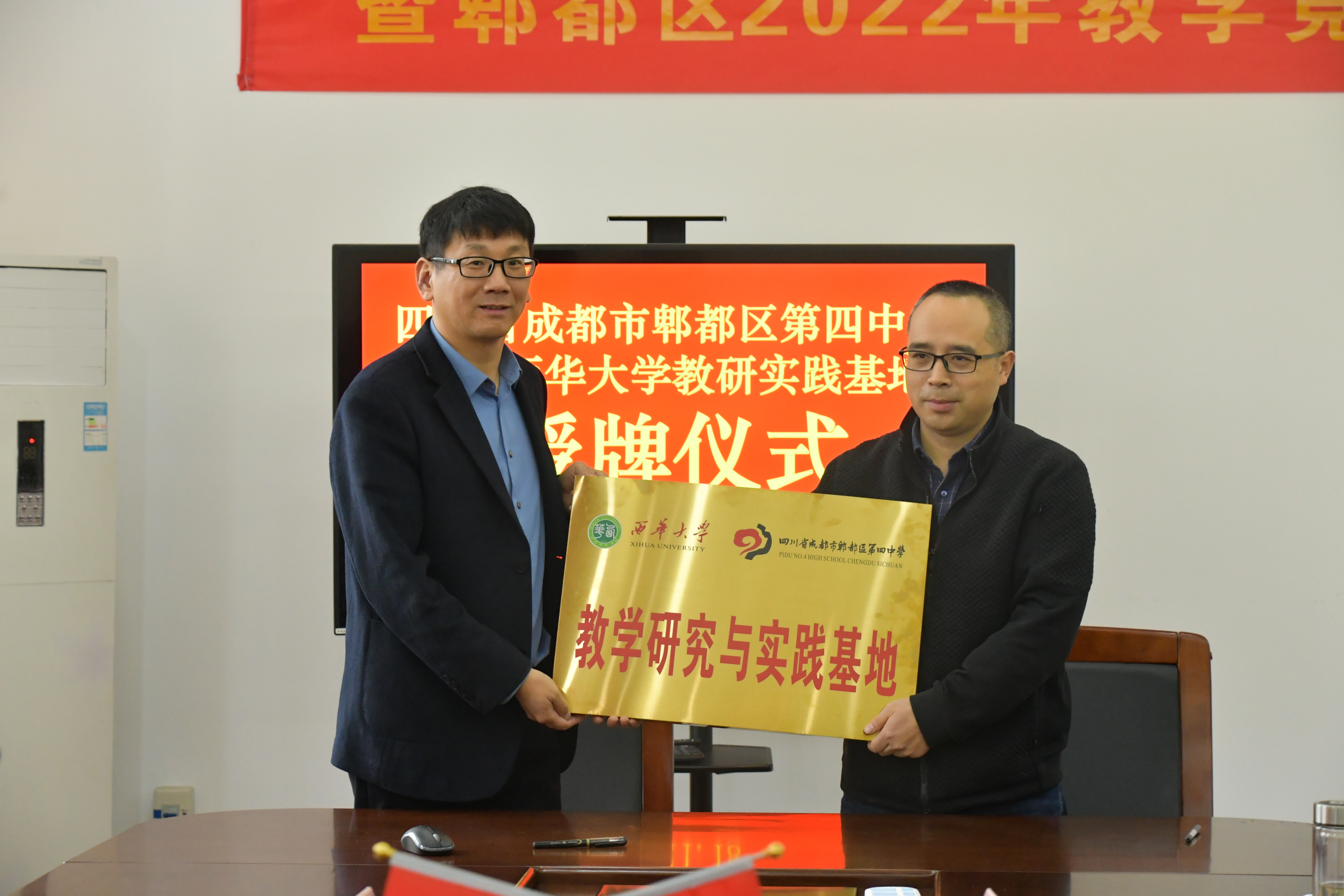 11月18日上午,副院长李学芹和英语系主任许媛鹓、日语系主任黄倩雯、英语系副主任张玄一行四人前往成都市郫都区第四中学,和郫都四中领导共同举行校(院)际教学研究实践基地签约及授牌仪式。