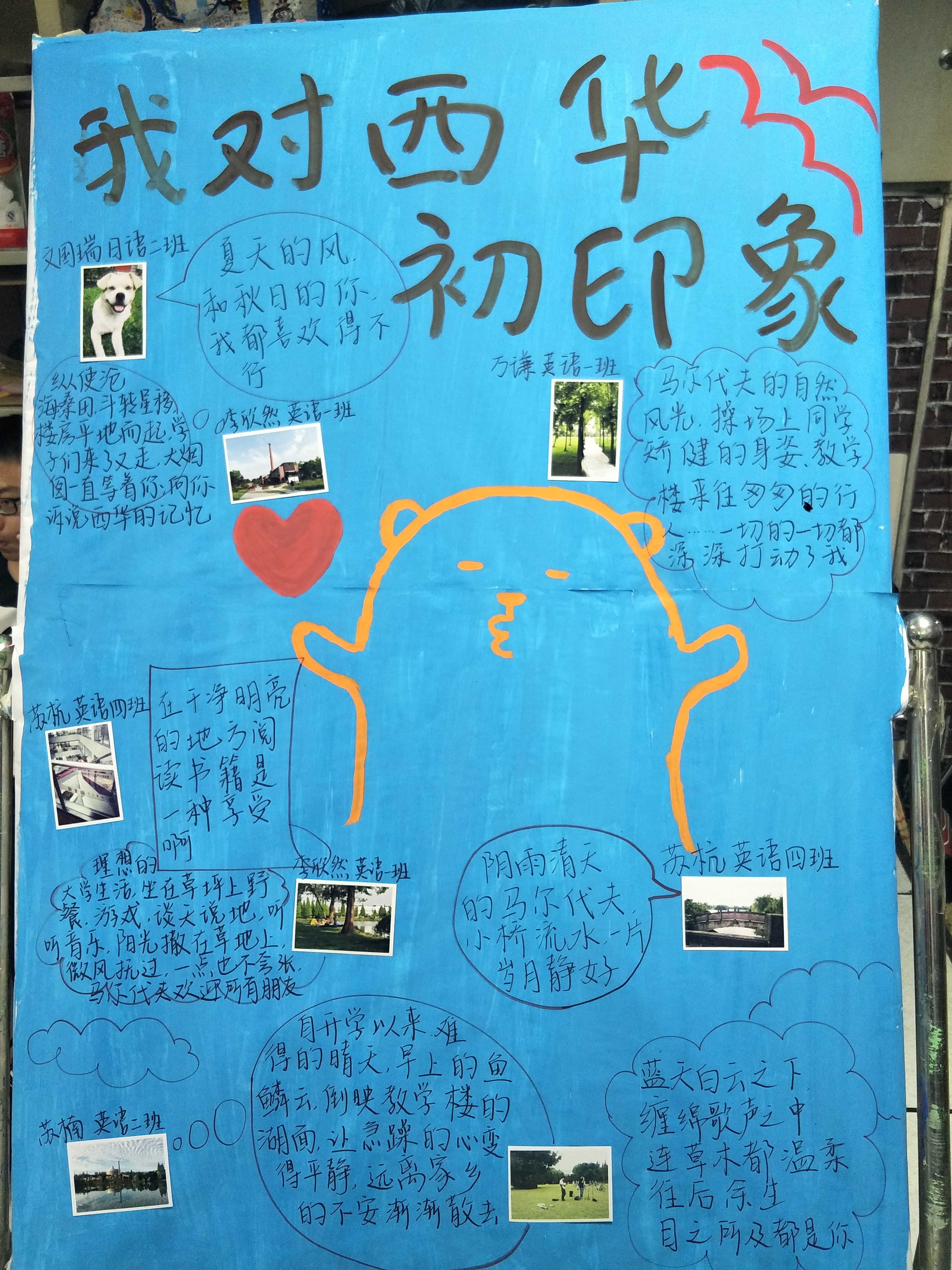 该活动面向2018级全体新生,为了全面了解西华新学子们对美丽西华的初印象,活动以班级为单位,各班至少选出两张以“我对西华初印象”为主题的照片,各班心理委员收齐后交给活动负责人。 我院青服队再从各班上交的照片进行筛选并打印出来,最后贴在提前绘制好的展板上,面向伟德国际1949全体师生进行展示。