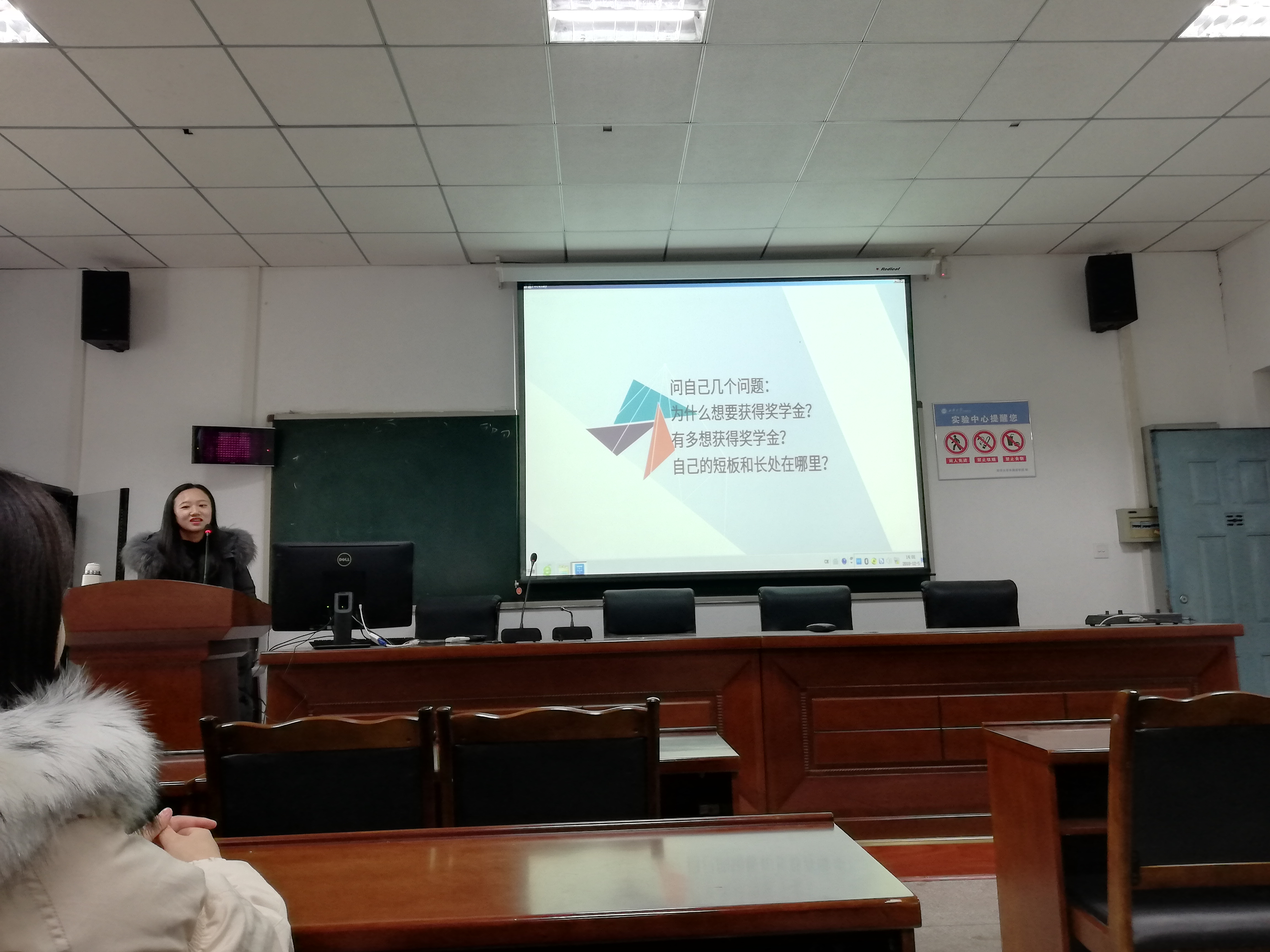 谯于倩学姐以三个问题开始她的分享:为什么要获得奖学金?有多想获得奖学金?自己的短板和长板在哪里?关于这三个问题的答案,每一位同学心中都有自己的答案。她说前两问的答案可能不尽相同,但最后一问是我们从现在就应该思考的问题,抓住自己长处,弥补自己的短处,确定自己未来的发展方向,并努力向自己的梦想靠拢。