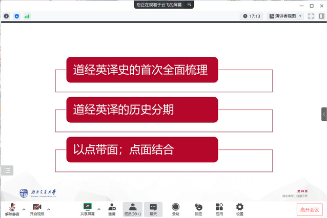 嘉宾分享完毕,至此,本次读书分享会圆满完成。“读书足以怡情,足以博彩,足以长才”,阅读是收获知识、提高素质的重要途径。立足于二十大的历史转折点,新时代青年当博览群书以开拓进取,笃学不倦而创造业绩。希望通过本次活动,鼓励西华青年养成阅读经典、品味好书的习惯,在书香中明确人生目标,迎三月春光充实自我,以青春韶华践行二十大精神!