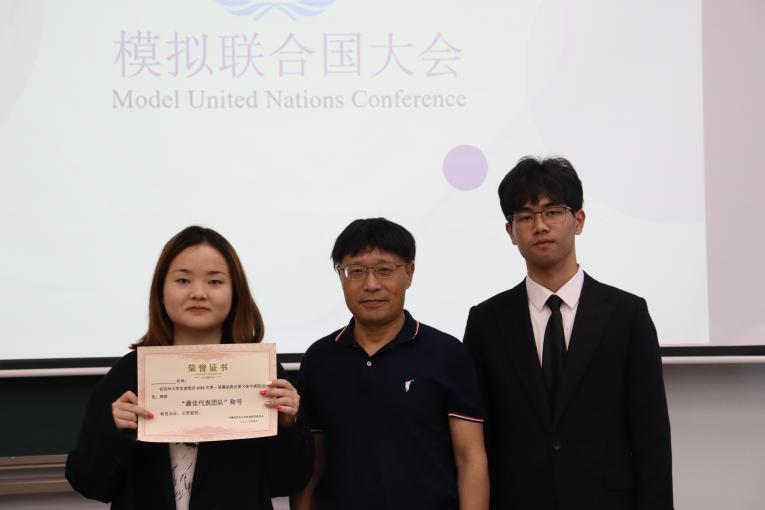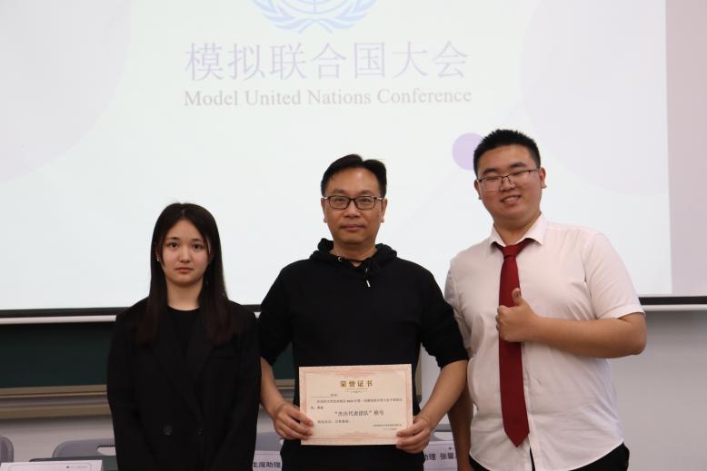 会议结束之后,由评委老师进行现场打分,评选出了最佳代表团队(Best Delegate)、杰出代表团队(Outstanding Delegate,分别由王朝培老师和王阿秋老师进行颁奖。颁奖结束之后,王朝培老师和王阿秋老师分别对此次模拟联合国大会和同学们的表现作出了肯定和赞扬。